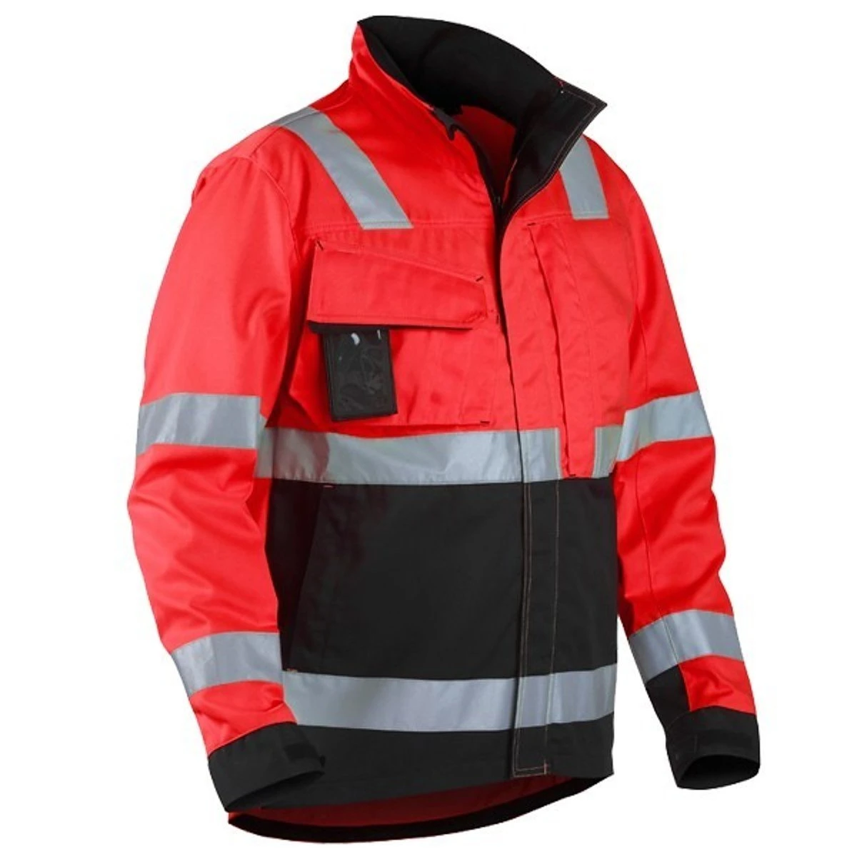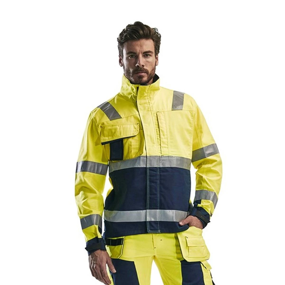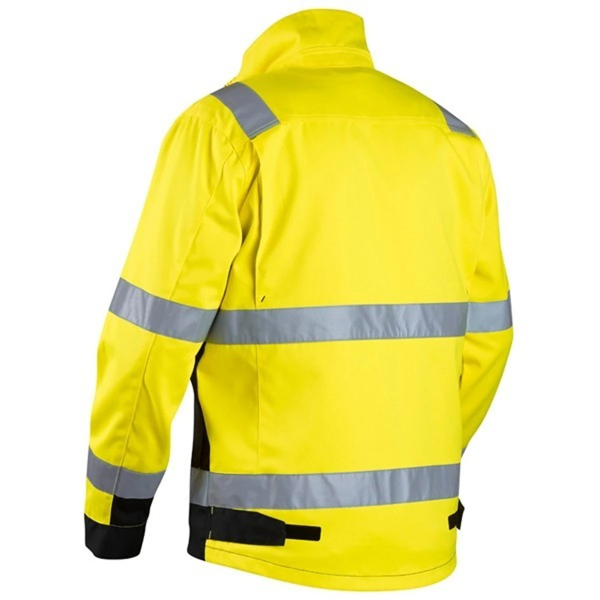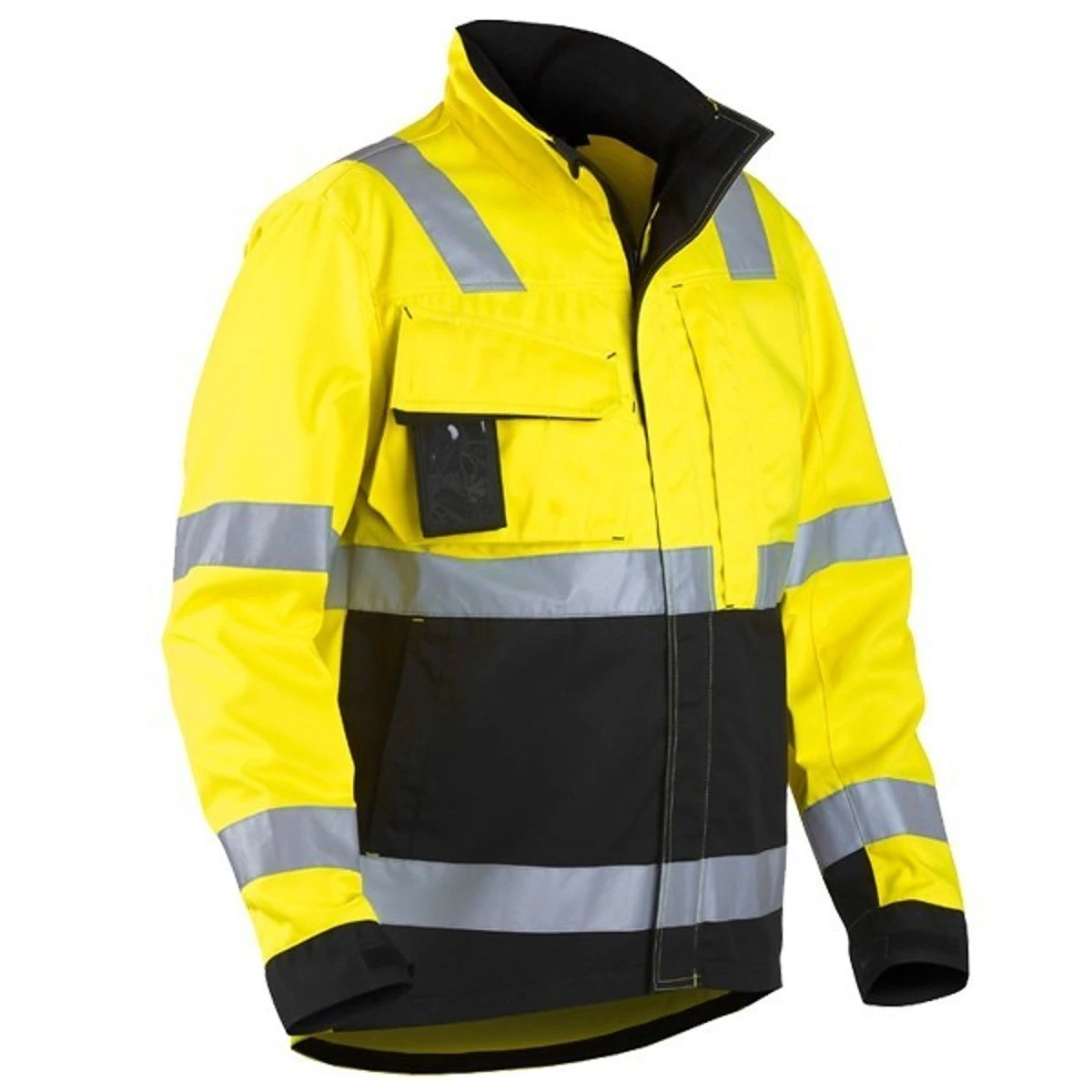 Warnschutz Bundjacke Klasse 3, verlängerter Rücken, kürzere Front für maximale Bewegungsfreiheit, gefütterter Kragen, Brusttasche, Ausweisfach, Innentasche mit Handytasche, durchgehender Reissverschluss mit Kinnschutz – verdeckt, dunkler Stoff für Bereiche mit hoher Verschmutzungsgefahr, Reflexstreifen an Bauch, Ärmeln und Schulter, nach EN471 Klasse 3