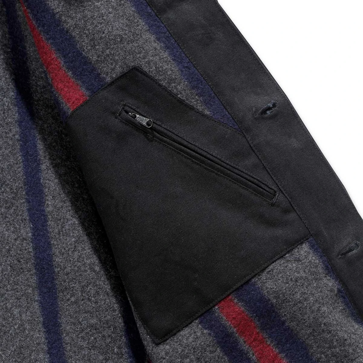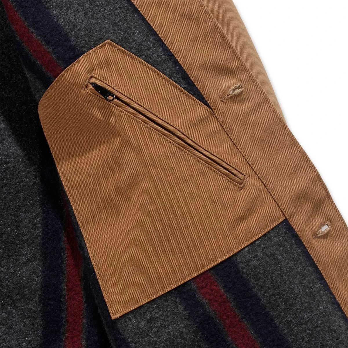 12 oz/yd² – 407 gsm · 100% Baumwolle · Firm duck · Lange Ärmel · Brusttasche · Zwei mit Nieten verstärkte Brusttaschen, rechte Brusttasche mit Taschenpatte und Knopf · Zwei tief sitzende Vordertaschen · Vordertasche mit gebürstetem Trikotfutter · Zwei Innentaschen · Brusttasche mit Knopfverschluss · Eine mit Reißverschluss und eine mit Klettverschluss · Knopfverschluss vorne · Verstellbare Knöpfe an den Bündchen · Flacher Saum unten · Dreifach gesteppte Hauptnähte