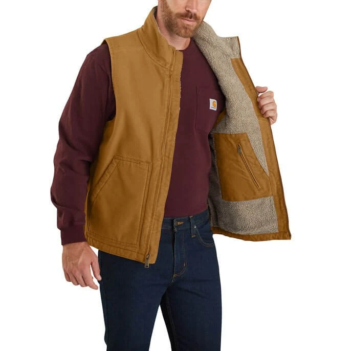 Weste aus gewaschenem Duck-Baumwollfleece mit Stehkragen,12 oz/yd² – 407 gsm · 100% Baumwolle · Baumwollcanvas, gewaschen · Ärmellos · Stehkragen · Zwei Vordertaschen zum Handwärmen · Vordertaschen mit Sherpa-Futter · Stifthalter an der rechten unteren Vordertasche · Durchgehender Frontreißverschluss · Verlängerter Saum am Rücken · Dreifach gesteppte Hauptnähte · Carhartt-Label auf Tasche genäht