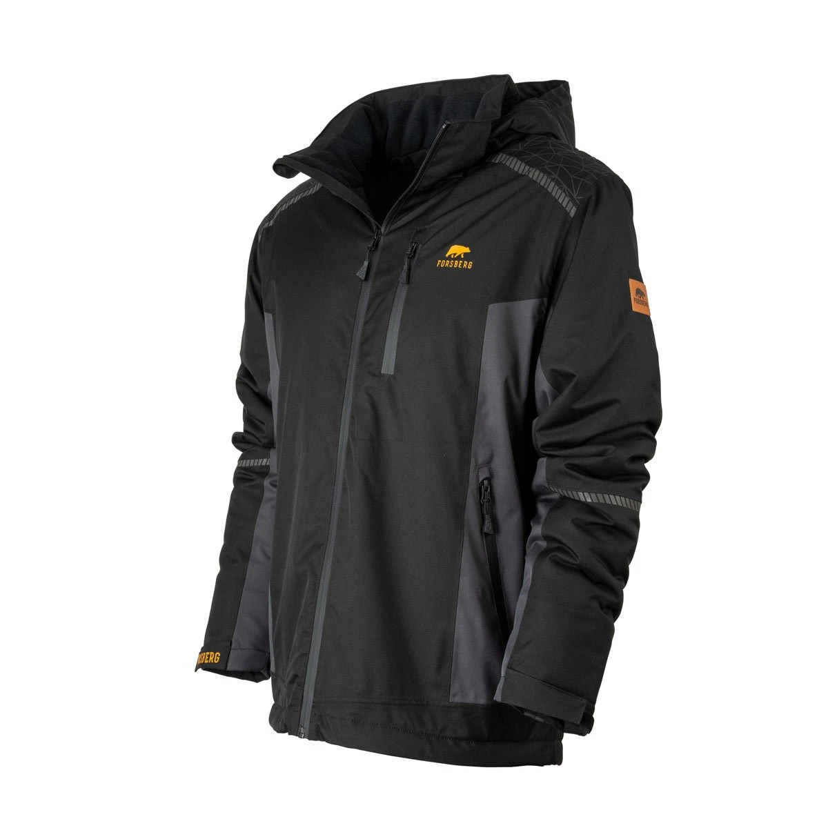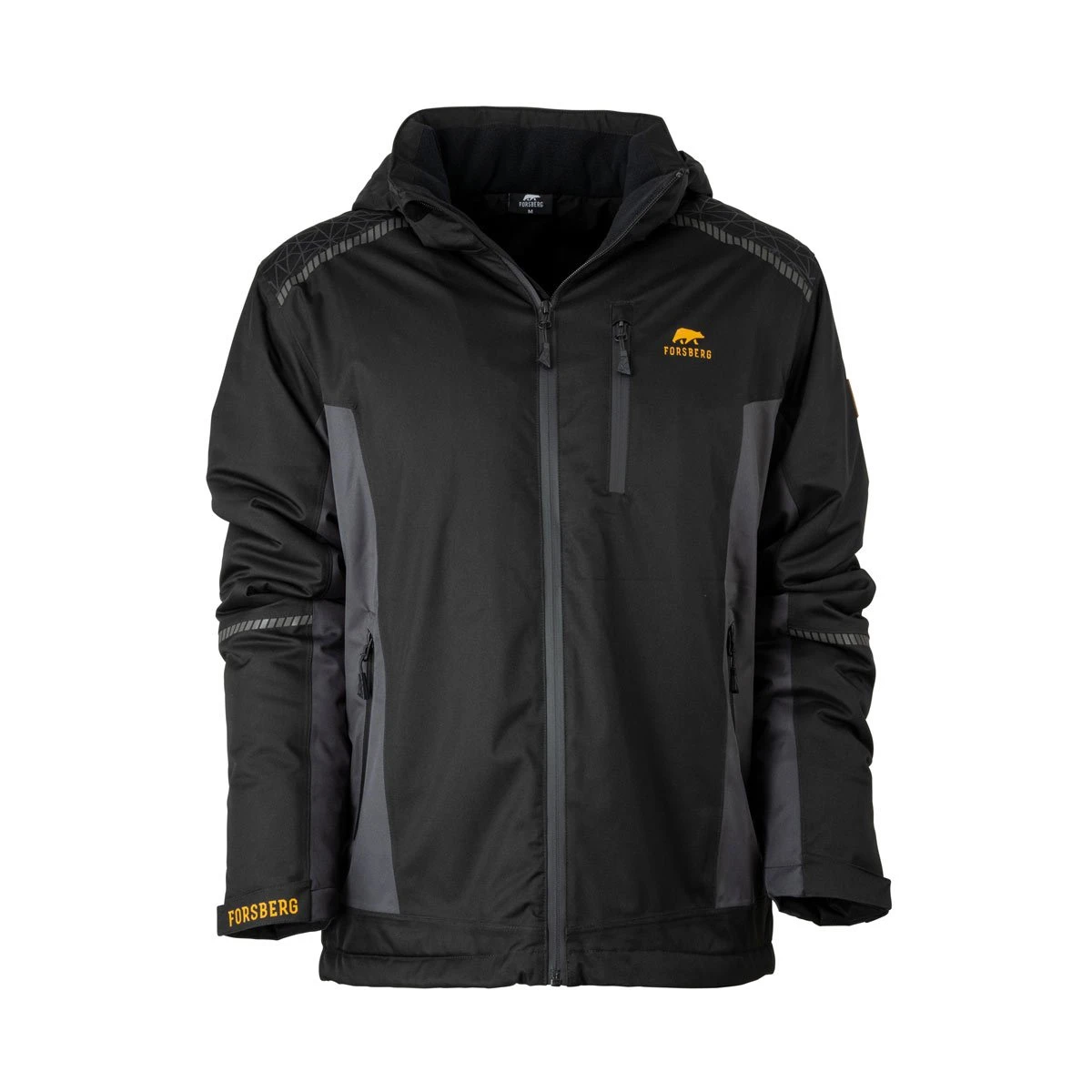 Mit der Forsberg Dynamic Membrane erzielt die Winterjacke eine sehr gute 10.000mm Wassersäule und somit eine beständige Wasser- und Winddichtigkeit, sowie eine mit 5000gr/m2/24h hohe Atmungsaktivität. Alle Nähte sind gegen eindringende Feuchtigkeit entsprechend versiegelt und getaped. Das funktionelle Obermaterial ist aus einem weichen und widerstandsfähigem Polyester. Der Schulterbereich wurde durch eine rutschfeste Silikonschicht in polygoner Wabenstruktur verstärkt. Ebenfalls wasserabweisend sind die Reissverschlüsse an der Front, der Ärmeltasche, der Brusttasche und den beiden Fronttaschen. Der Zwei-Wege-Frontzipper geht bis in den hochschliessenden Kragen und wird durch einen Kinnschutz abgerundet.