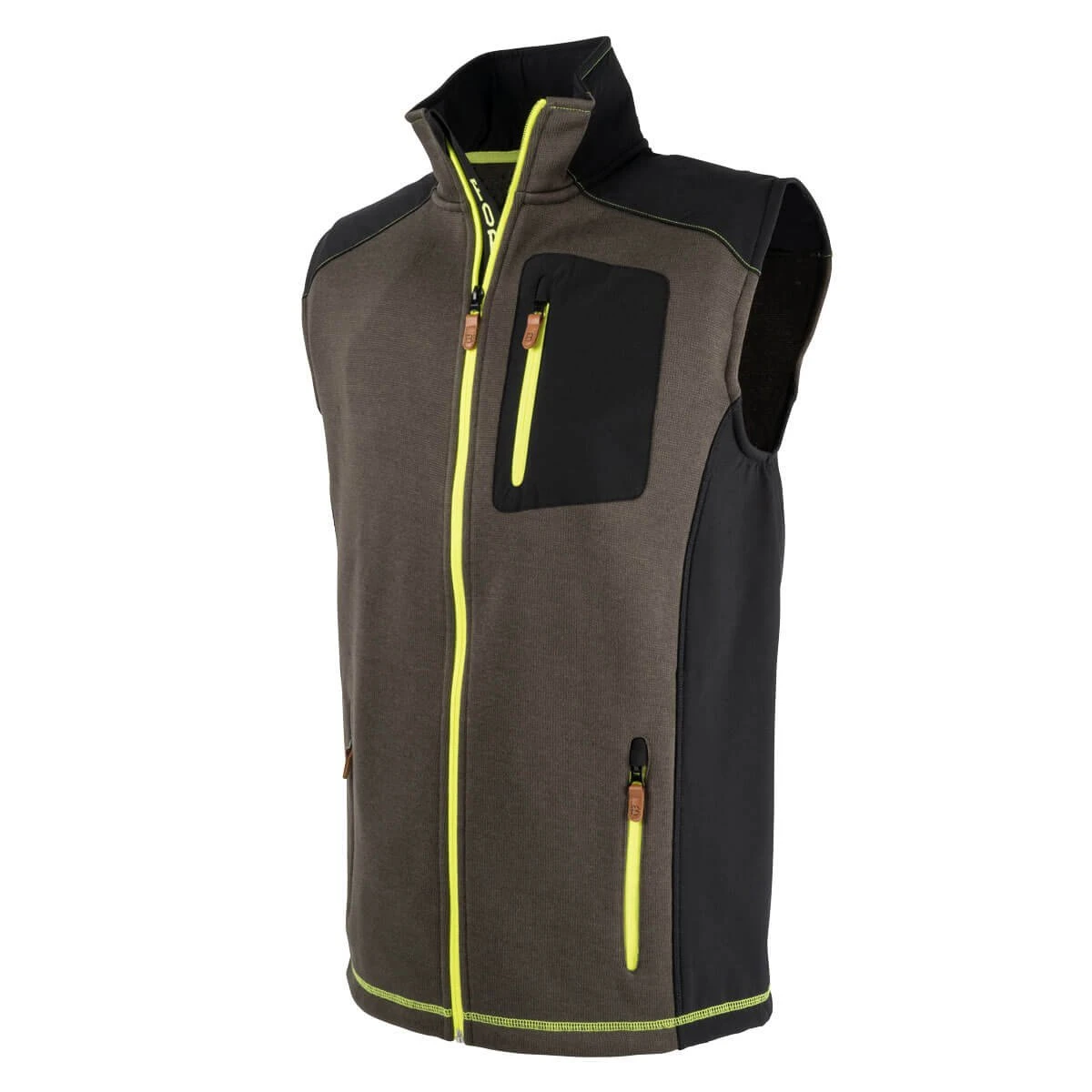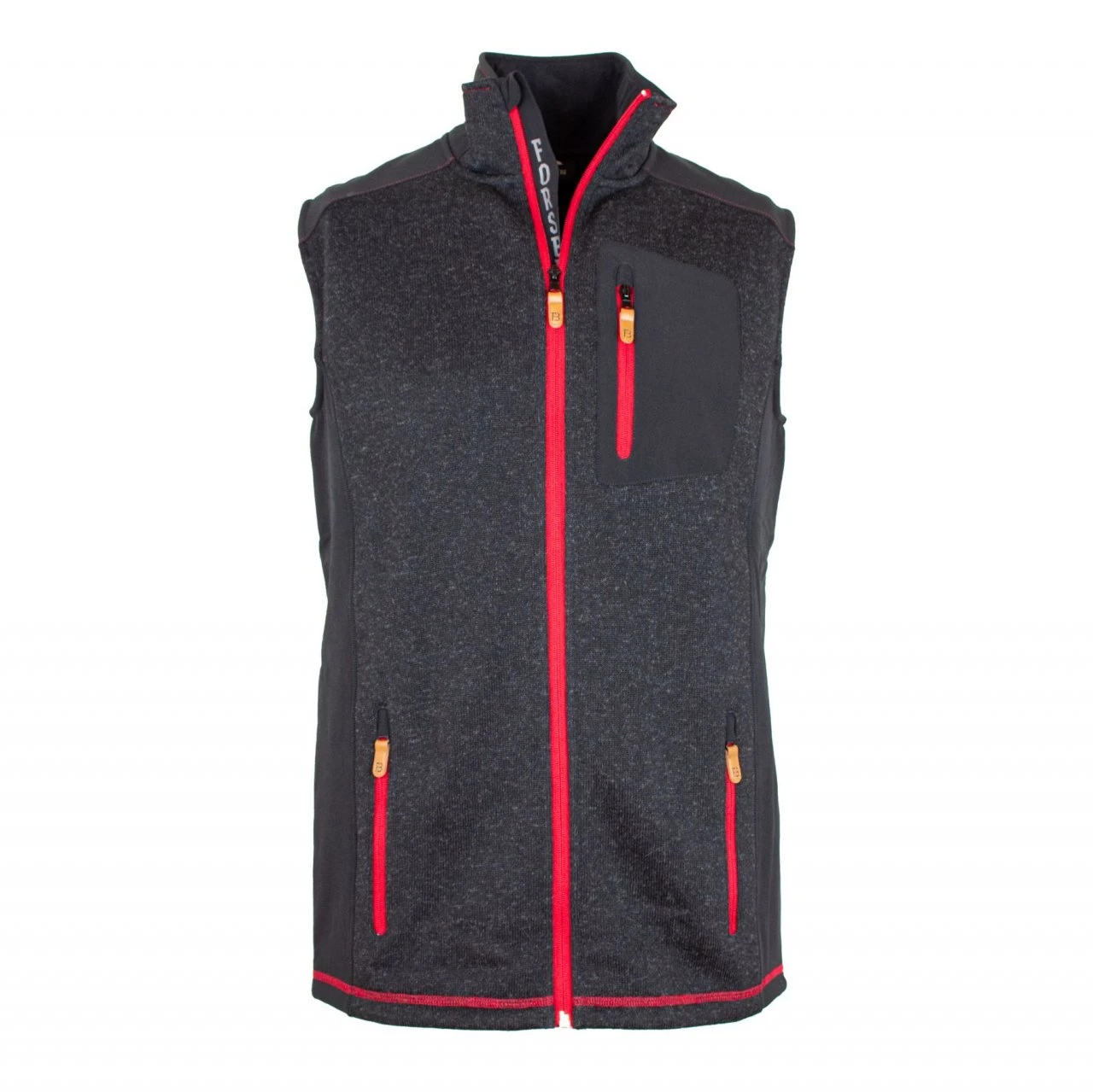 Der Forsberg VESTA hat einen durchgehenden Reissverschluss, der bis zum hohen Kragen reicht und zusätzlich über einen Kinnschutz verfügt. Wie die großen Vordertaschen wird auch die aufgesetzte Brusttasche in Softshell mit einem kontrastfarbigen Reißverschluss verschlossen. Auch der Schulterbereich und die Seitentaille wurden mit Softshell verstärkt. Die Ärmelöffnung und der Kragenrand haben ein Gummiband, das die Weste formstabil hält. Der Rücken ist leicht gestreckt und gibt das Gesäß auch beim Beugen nicht frei.