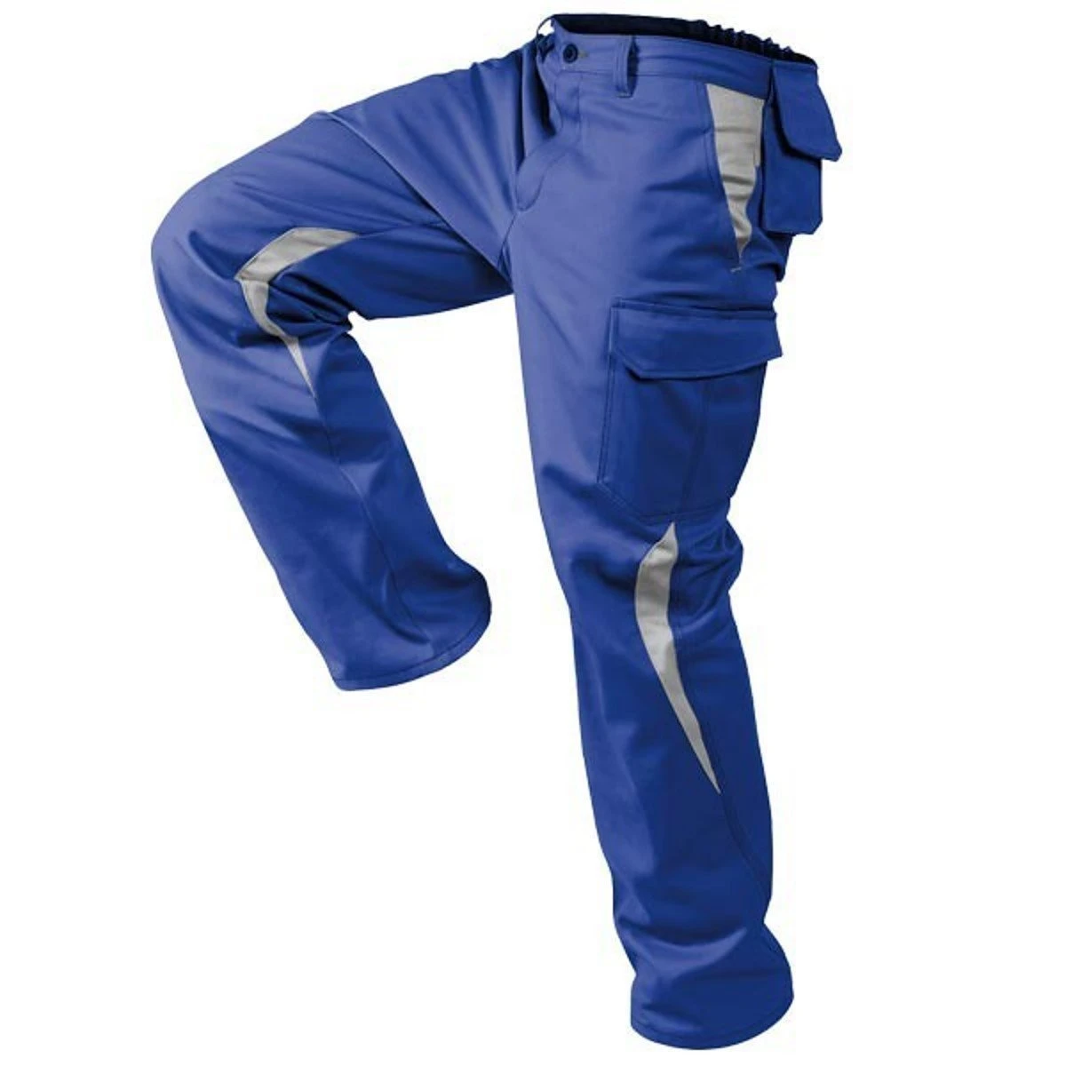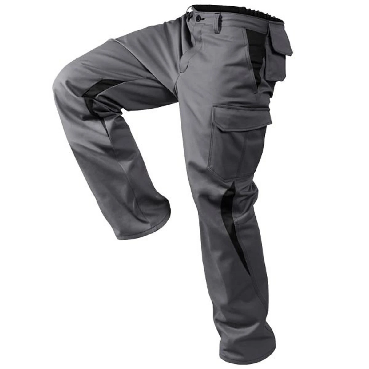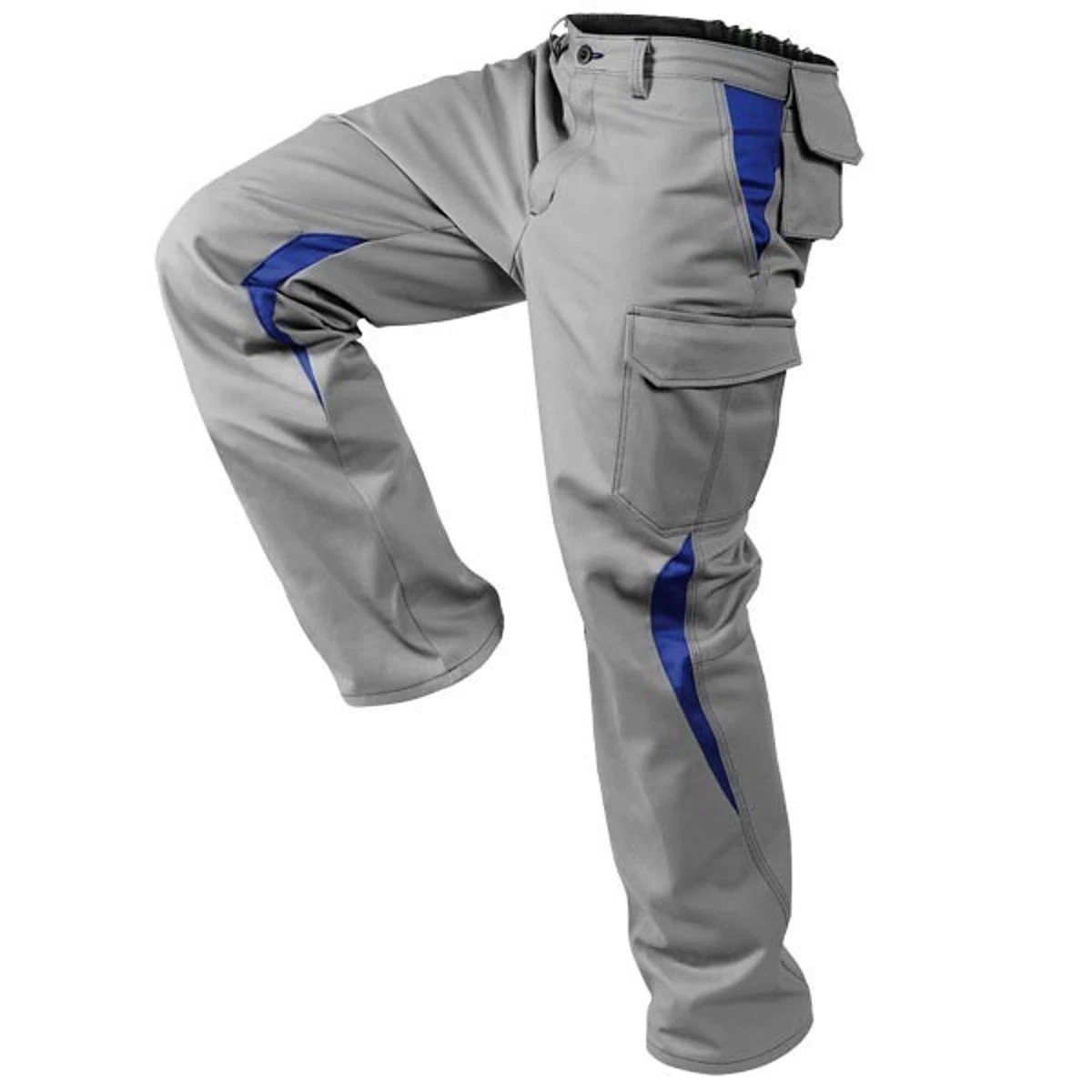 Arbeitshose für warme und sommerliche Temperaturen, leichtes und robustes Gewebe 240gr/qm, zwei Seitentaschen, doppelte Meterstabtasche rechts, verstärkte Gesäßtasche mit Patte und Klettverschluss, Schenkeltasche mit Patte und Klett, Smartphonetasche, ergonomische Linienführung, vorgeformte Knie, Kniepolstertaschen, Schlitz mit Reissverschluss, Bund mit Gummizug und Knopf, Belastungspunkte mit Riegel, Kontraststeppung